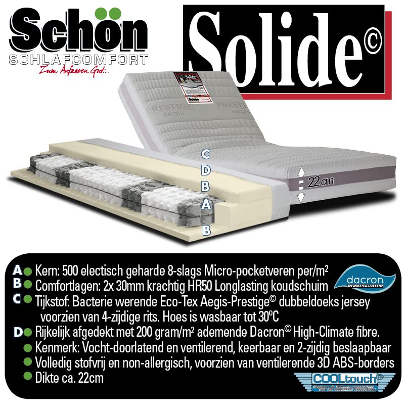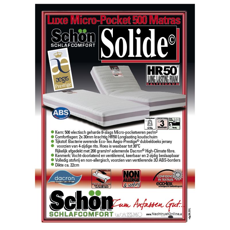 De enorm luxe Micro-pocket matras Solide© van het Duitse merk Schön. De 500(!!) thermisch geharde 8-slagsveren per m2 dragen en steunen het lichaam uiterst genuanceerd. De matraskern is verdeeld in 7 ergonomische lichaamszones. Daardoor ontstaat een uitmuntende ondersteuning en een hoog ventilerend en ademend vermogen. De tweezijdige afwerking van de Solide© is van zeer krachtig en elastisch HR50 LongLasting koudschuim, voor een uitmuntende aansluiting aan het lichaam. De open celstructuur zorgt voor ventilatie en voorkomt vochtophoping. De edele bekledingsstof is van originele Aegis-Prestige© voor optimale ventilatie. Bovendien is Aegis© bacterie-werend en huismijt-afstotend. De Solide-tijkstof is rondom voorzien van extra ademende 3D ABS-border.