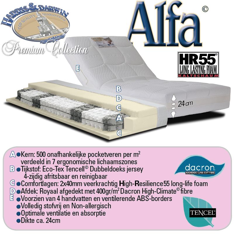 Pocketmatras Alfa uit de befaamde Harris&Darwin Premium©-collectie. Luxe pocketveren matras met krachtig HR55 koudschuim aan twee kanten afgewerkt. De edele kern met 500 onafhankelijke Micro-pocketveren per m2 (8-slags thermsich gehard High-carbon steel) verdeeld in 7 ergonomische lichaamszones, steunt het lichaam uiterst genuanceerd, en geeft een enorm comfort. Luxueus afgewerkt met originele, natuurlijke Tencel© bekledingsstof met uitmuntende eigenschappen. Voorzien van 4 praktische handvatten en ademende 3D ABS-borders. Voor een overweldigende slaapervaring.