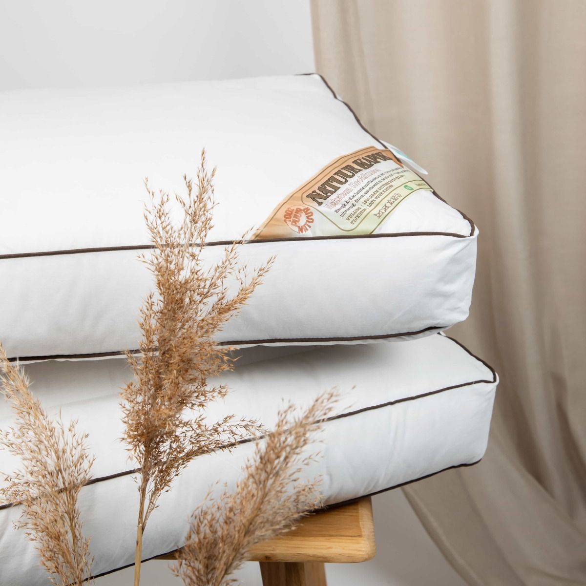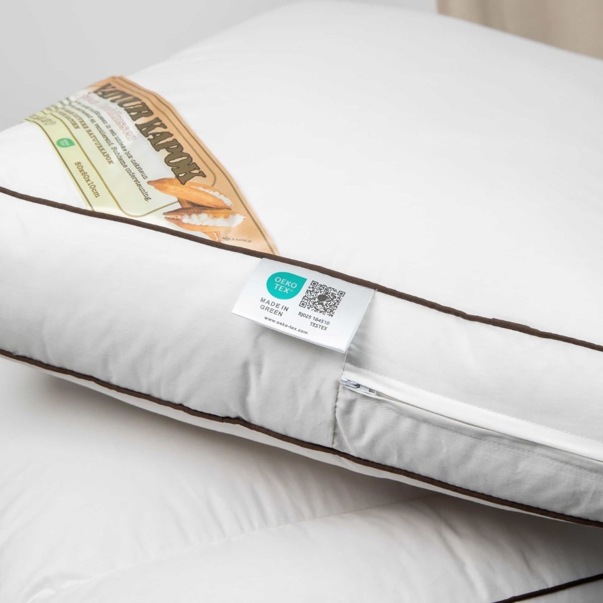 Kapok Neksteun Hoofdkussens zijn voorzien van een gecertificeerd Oeko-Tex Made In Green label.