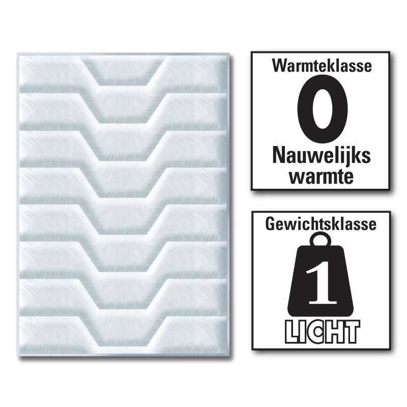 - Isolatiewaarde 0 (nauwelijks warmte), gewichtsklasse 1 (lichtgewicht)